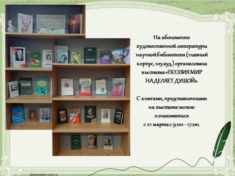 На абонементе художественной литературы научной библиотеки (главный корпус, 103 ауд.) организована выставка «ПОЭЗИЯ МИР НАДЕЛЯЕТ ДУШОЙ».