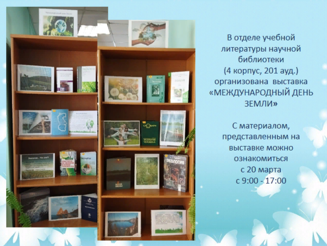 В отделе учебной литературы научной библиотеки (4 корпус, 201 ауд.) организована выставка «МЕЖДУНАРОДНЫЙ ДЕНЬ ЗЕМЛИ». С информацией, представленной на выставке можно ознакомиться с 20 марта с 9:00 - 17:00.