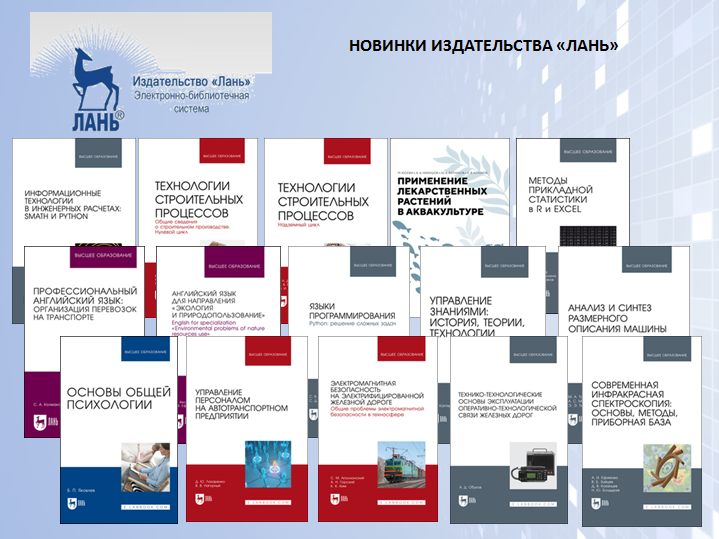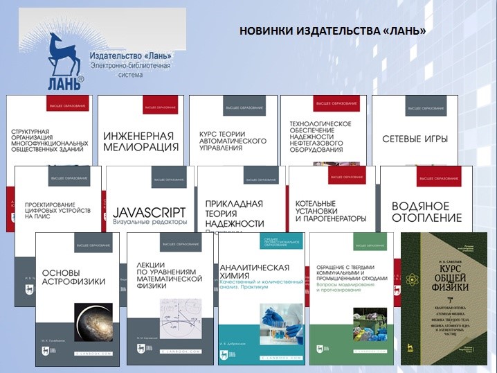 12.04.2023К Дню космонавтики и 60-летию со дня первого полёта женщины в космос посвящена выставка "Парила чайка над планетой", представленная в отделе учебной литературы научной библиотеки АГТУ (4 к., 203 ауд.). 11.04.2023Предлагаем ознакомиться с новинками издательства "Лань".