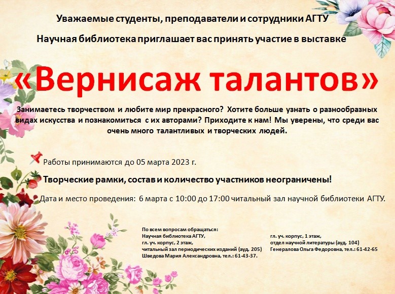 07.02.2023Научная библиотека приглашает принять участие в выставке «Вернисаж талантов».