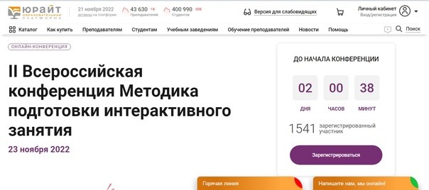 21.11.2022Образовательная платформа «Юрайт» приглашает принять участие в онлайн-конференции "II Всероссийская конференция Методика подготовки интерактивного занятия".Дата и время проведения: 23 ноября в 10:15 (МСК)