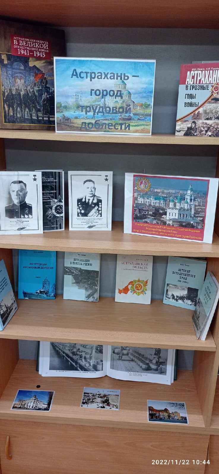 15 ноября 2022 г. Указом № 829 Президента Российской Федерации В.В. Путина городу Астрахань присвоено почетное звание «Город трудовой доблести». Этому знаменательному событию посвящена выставка, организованная в отделе научной литературы (главный корпус, 104 ауд.)