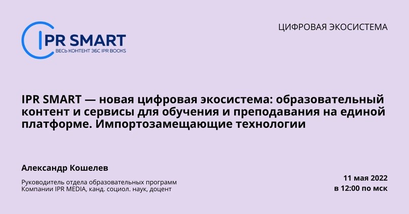 В 12:00 (МСК) «IPR SMART — новая цифровая экосистема: образовательный контент и сервисы для обучения и преподавания на единой платформе. Импортозамещающие технологии».