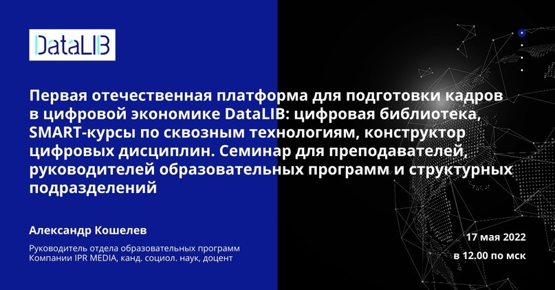 В 12:00 (МСК) «Первая отечественная платформа для подготовки кадров в цифровой экономике DataLIB: цифровая библиотека, SMART-курсы по сквозным технологиям, конструктор цифровых дисциплин. Семинар для преподавателей, руководителей образовательных программ и структурных подразделений».