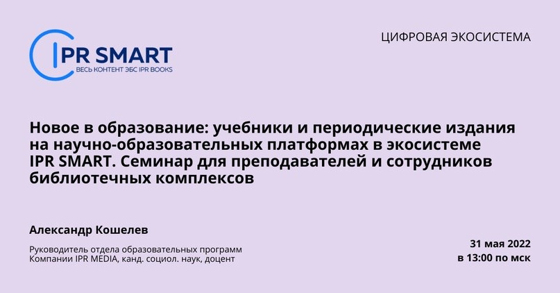 В 13:00 (МСК) «Новое в образование: учебники и периодические издания на научно-образовательных платформах в экосистеме IPR SMART. Семинар для преподавателей и сотрудников библиотечных комплексов».