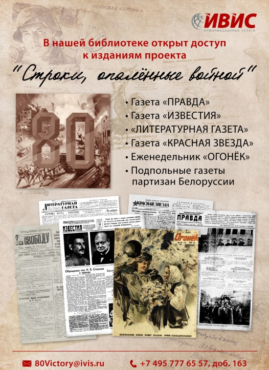 С 1 января по 30 июня 2025 года в рамках проекта «Строки, опаленные войной», посвященному 80-летию Великой Победы, компанией «ИВИС» предоставлен бесплатный доступ к оцифрованным архивам газет, издававшихся в годы Великой Отечественной войны. Участники проекта получают доступ к оцифрованным архивам пяти ключевых изданий: «Правда», «Известия», «Литературная газета», «Красная звезда», «Огонёк», а также к коллекции белорусских партизанских газет. Читатели могут читать, сохранять, печатать материалы и использовать поиск по тексту. Проект направлен на сохранение исторической памяти и борьбу с фальсификацией истории.