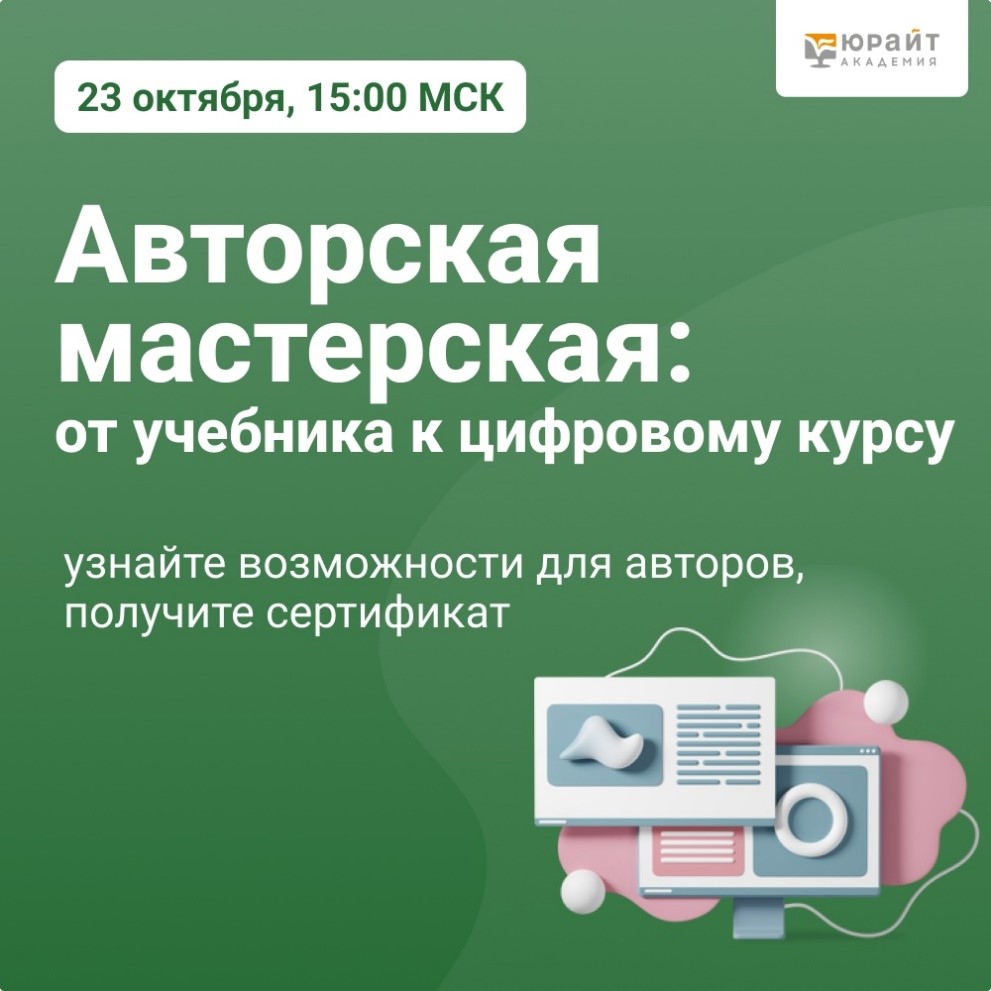 24.10.2024Образовательная платформа «Юрайт» приглашает принять участие на бесплатной мастерской в формате дня открытых дверей редакции «Авторская мастерская: от учебника к цифровому курсу».