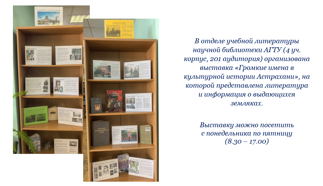 13.11.2024Отдел учебной литературы научной библиотеки АГТУ (4 уч. корпус, 201 аудитория) приглашает на выставку «Громкие имена в культурной истории Астрахани», на которой представлена литература и информация о выдающихся земляках
